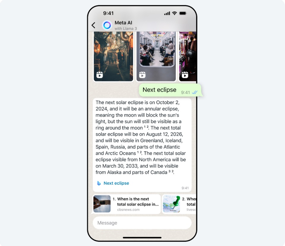 Η Google έχει επίσης το δικό της έργο τεχνητής νοημοσύνης, το Gemini. Αλλά σε μια απρόσμενη ανατροπή, η Meta θα χρησιμοποιήσει αποτελέσματα από τις μηχανές αναζήτησης των δύο ανταγωνιστών της μέσα στο chatbot για «γνώσεις σε πραγματικό χρόνο».