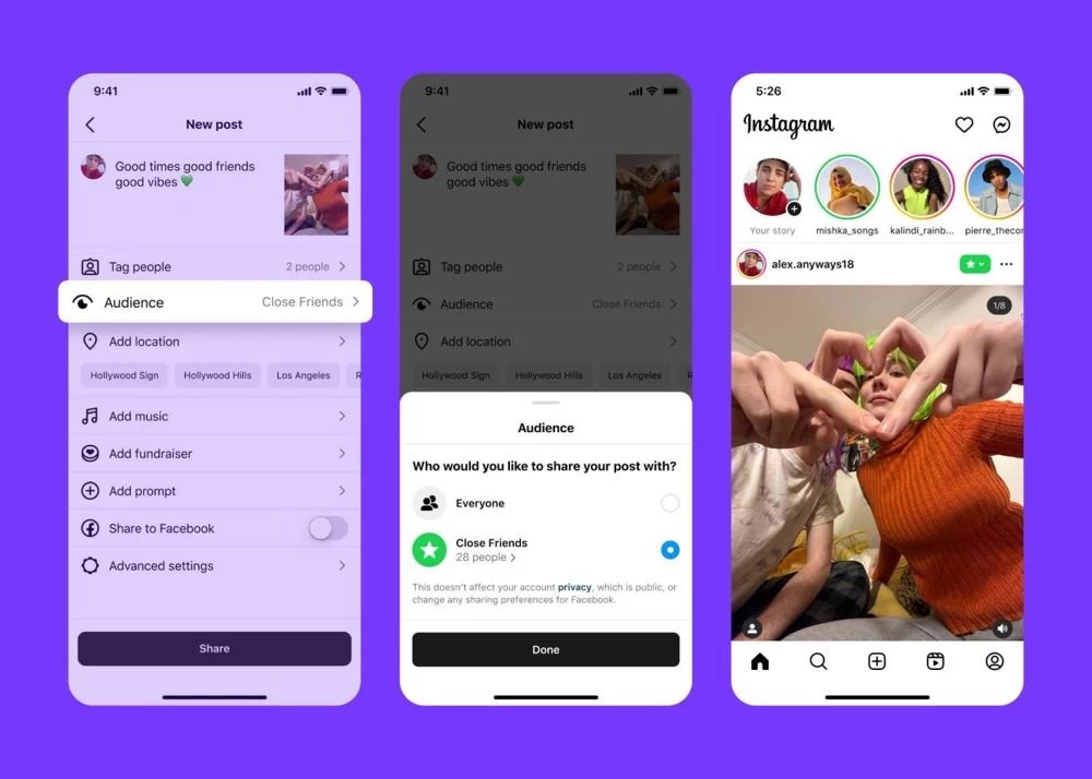 Το εργαλείο «στενοί φίλοι» του Instagram επιτρέπει στους χρήστες να επιλέγουν ορισμένους φίλους τους που εμπιστεύονται περισσότερο και να τους τοποθετούν σε μια λίστα. Στη συνέχεια, οι χρήστες μπορούν να μοιράζονται stories μόνο με αυτούς τους φίλους. Όσοι δεν βρίσκονται σε αυτήν την λίστα δεν βλέπουν τα stories.