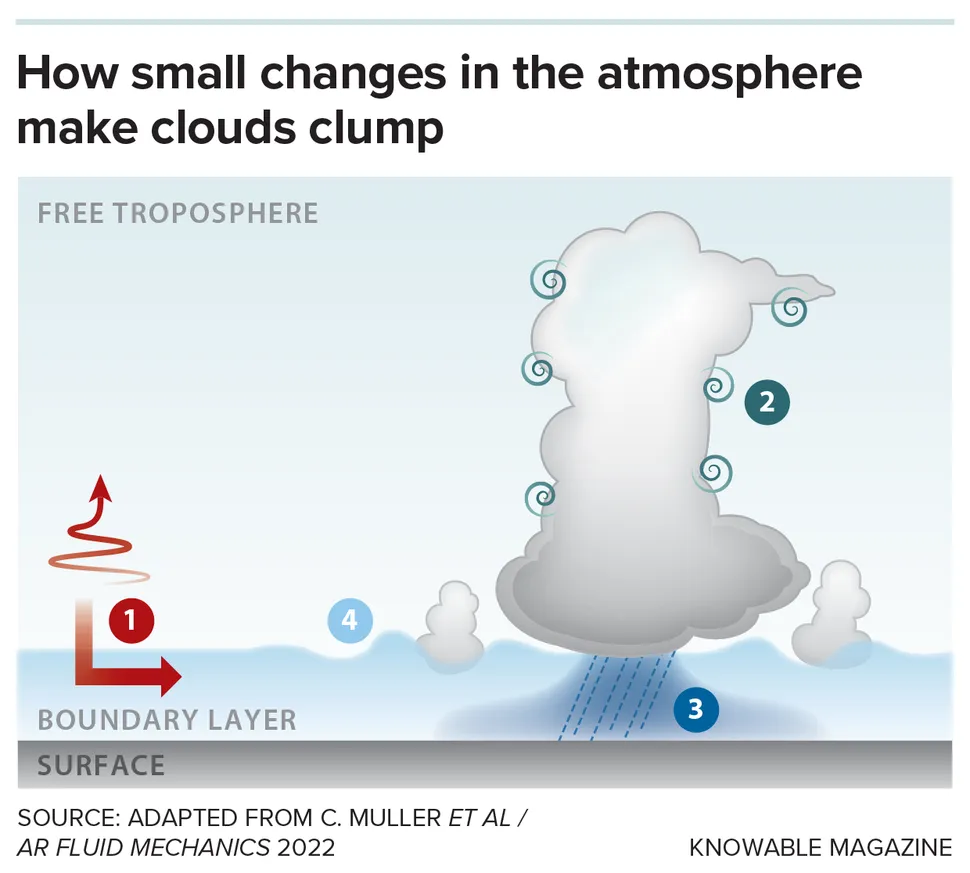 Μόλις οι επιστήμονες άρχισαν να στρέφουν την προσοχή τους όχι μόνο έξω από τα σύννεφα, αλλά και κάτω από αυτά καθώς και στις άκρες τους, ανακάλυψαν και άλλες διεργασίες μικρής κλίμακας που τους βοηθούν να εξηγήσουν γιατί τα σύννεφα «συναθροίζονται». Αυτές οι διάφορες διεργασίες, τις οποίες περιέγραψαν η Muller και οι συνεργάτες της στο Annual Review of Fluid Mechanics, συγκεντρώνουν ή συγκρατούν θύλακες θερμού και υγρού αέρα, με αποτέλεσμα να σχηματίζονται περισσότερα σύννεφα σε περιοχές που είναι ήδη νεφελώδεις. Αυτές οι μικρο-διεργασίες δεν είχαν κατανοηθεί πλήρως στο παρελθόν, επειδή συχνά επισκιάζονται από μεγαλύτερα μετεωρολογικά μοτίβα.