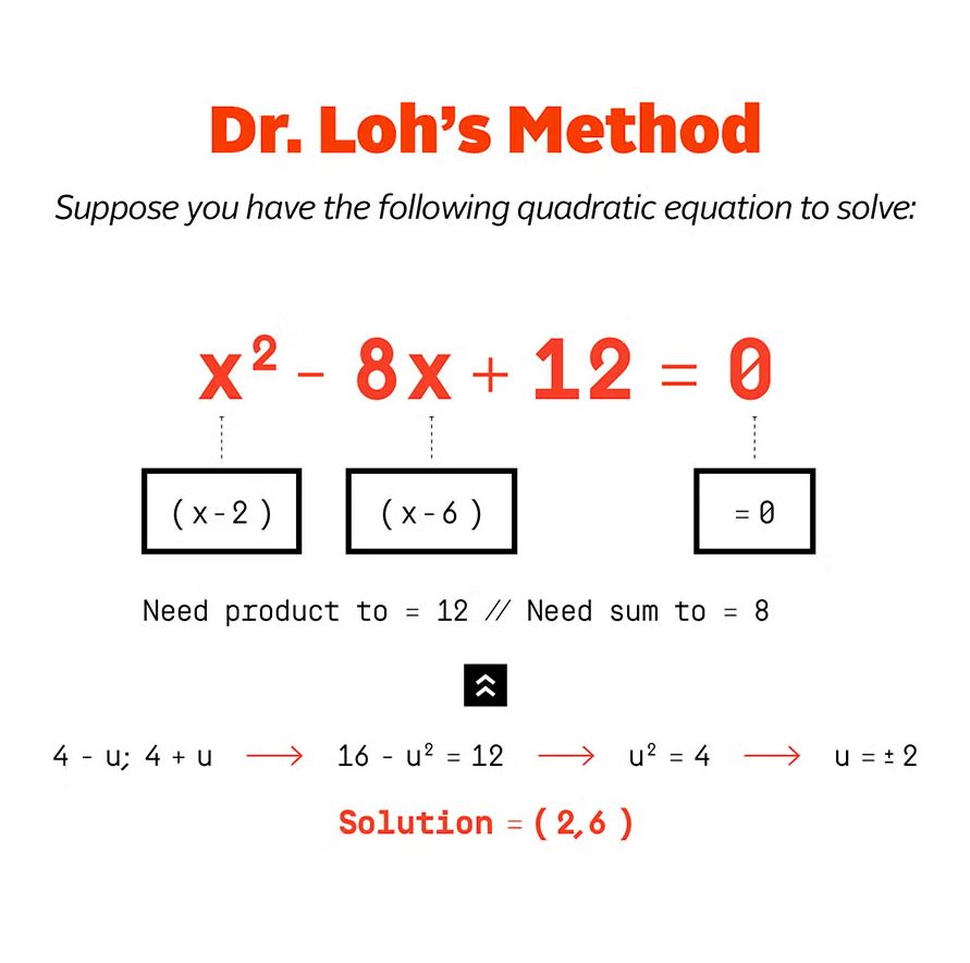 «Κανονικά, όταν κάνουμε ένα πρόβλημα παραγοντοποίησης, προσπαθούμε να βρούμε δύο αριθμούς που πολλαπλασιαζόμενοι δίνουν 12 και προστιθέμενοι δίνουν 8», είπε ο Dr. Loh. Αυτοί οι δύο αριθμοί είναι η λύση της εξίσωσης δευτέρου βαθμού, αλλά οι μαθητές χρειάζονται πολύ χρόνο για να τους βρουν, καθώς συχνά χρησιμοποιούν τη μέθοδο της δοκιμής και σφάλματος.