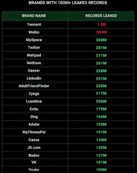 Μετά το QQ ακολουθεί το Weibo, η κινεζική πλατφόρμα κοινωνικής δικτύωσης, η οποία είχε 504 εκατομμύρια εγγραφές. Μερικές από τις άλλες μεγαλύτερες διαρροές προήλθαν από το MySpace (360 εκατ.), το Twitter (281 εκατ.), το Linkedin (251 εκατ.) και το AdultFriendFinder (220 εκατ.).