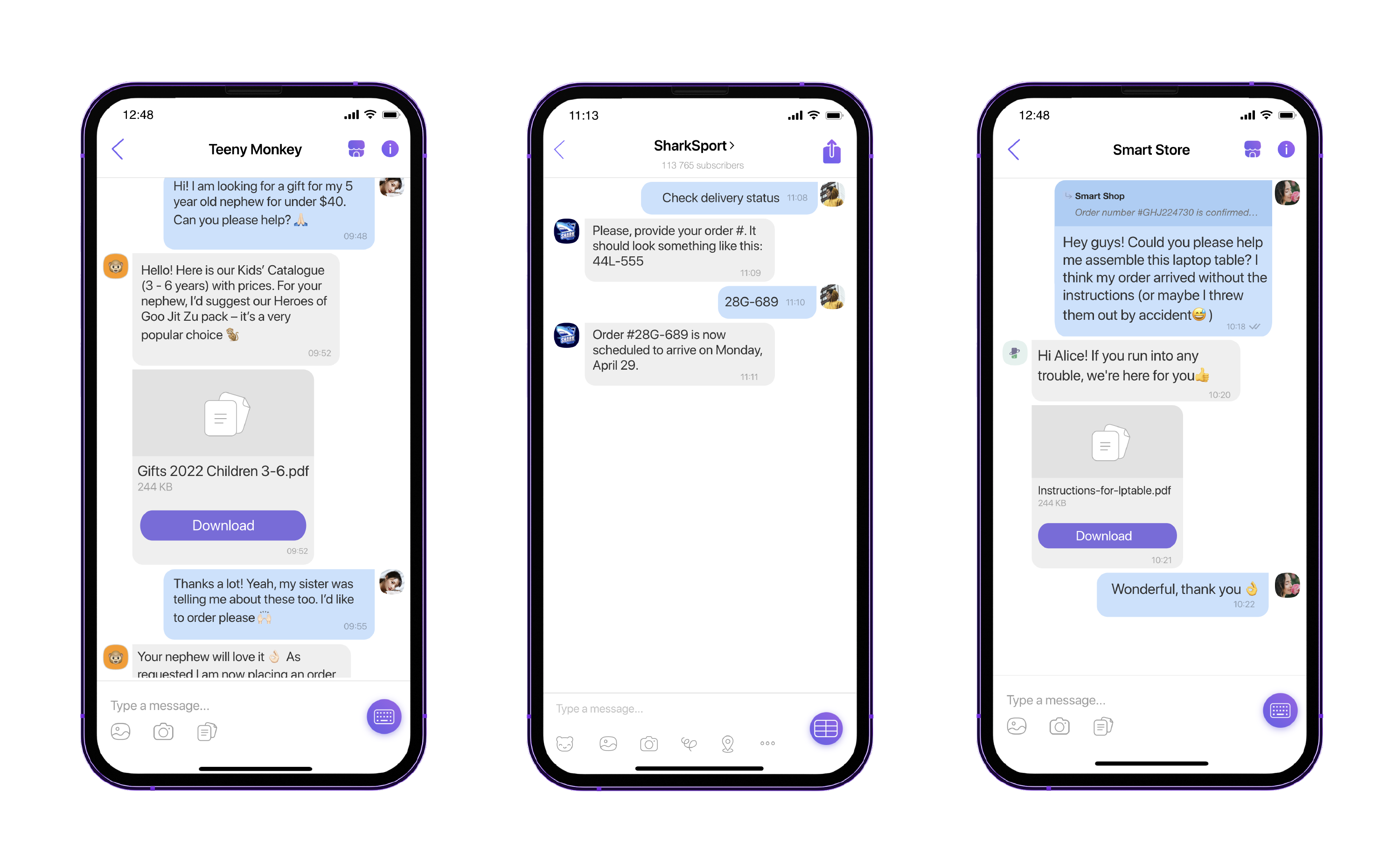 - Υποστηρίξτε το έργο της ομάδας σας με chatbot για να προσφέρετε άμεσες απαντήσεις στις πιο συχνές ερωτήσεις και να βελτιστοποιήσετε τις αλληλεπιδράσεις με τους πελάτες. Για παράδειγμα, οι επιχειρήσεις στο Viber χρησιμοποιούν chatbots για να βοηθήσουν τους χρήστες να αναζητήσουν διαθέσιμα προϊόντα, να ελέγξουν τους όρους παράδοσης, να ελέγξουν τις ώρες εργασίας και πολλά άλλα.