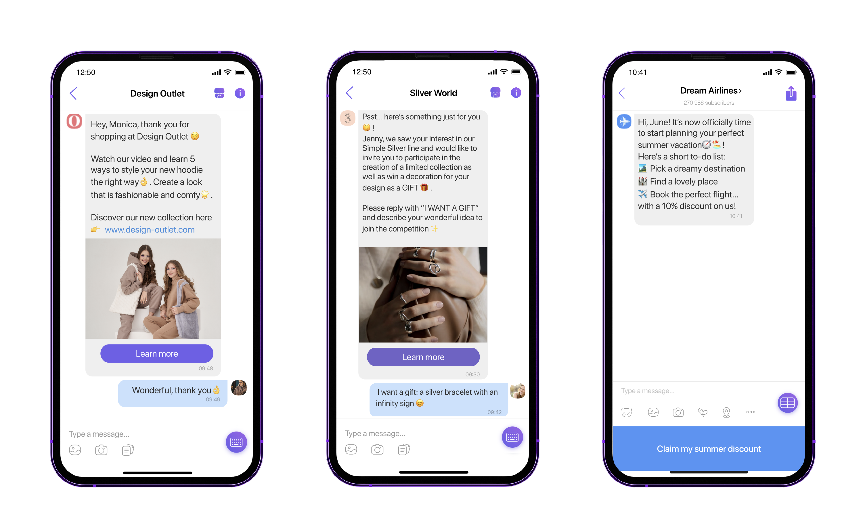 Η αξιοποίηση πολυμέσων μπορεί να βελτιώσει σημαντικά την εμπειρία του χρήστη για την εταιρεία σας. Τα οπτικά στοιχεία κάνουν το περιεχόμενό σας πιο ελκυστικό και βοηθούν στην πιο αποτελεσματική μετάδοση του μηνύματός σας. Πείτε συναρπαστικές ιστορίες με πολυμέσα ώστε να ενθαρρύνετε την αλληλεπίδραση. Για παράδειγμα, οι επιχειρήσεις στο Viber κοινοποιούν εντυπωσιακές εικόνες και βίντεο για να μιλήσουν για τα νέα προϊόντα τους, στέλνουν κείμενα με εκφραστικά emojis και κουμπιά CTA για να ενθαρρύνουν τις αγορές και μοιράζονται διάφορα αρχεία με τους πελάτες τους μέσω επαγγελματικών μηνυμάτων. Προσαρμόζουν επίσης τα chatbots τους στις ανάγκες του κοινού, ενώ στέλνουν αυτοκόλλητα και χρησιμοποιούν καρουζέλ για να τραβήξουν την προσοχή των πελατών τους.