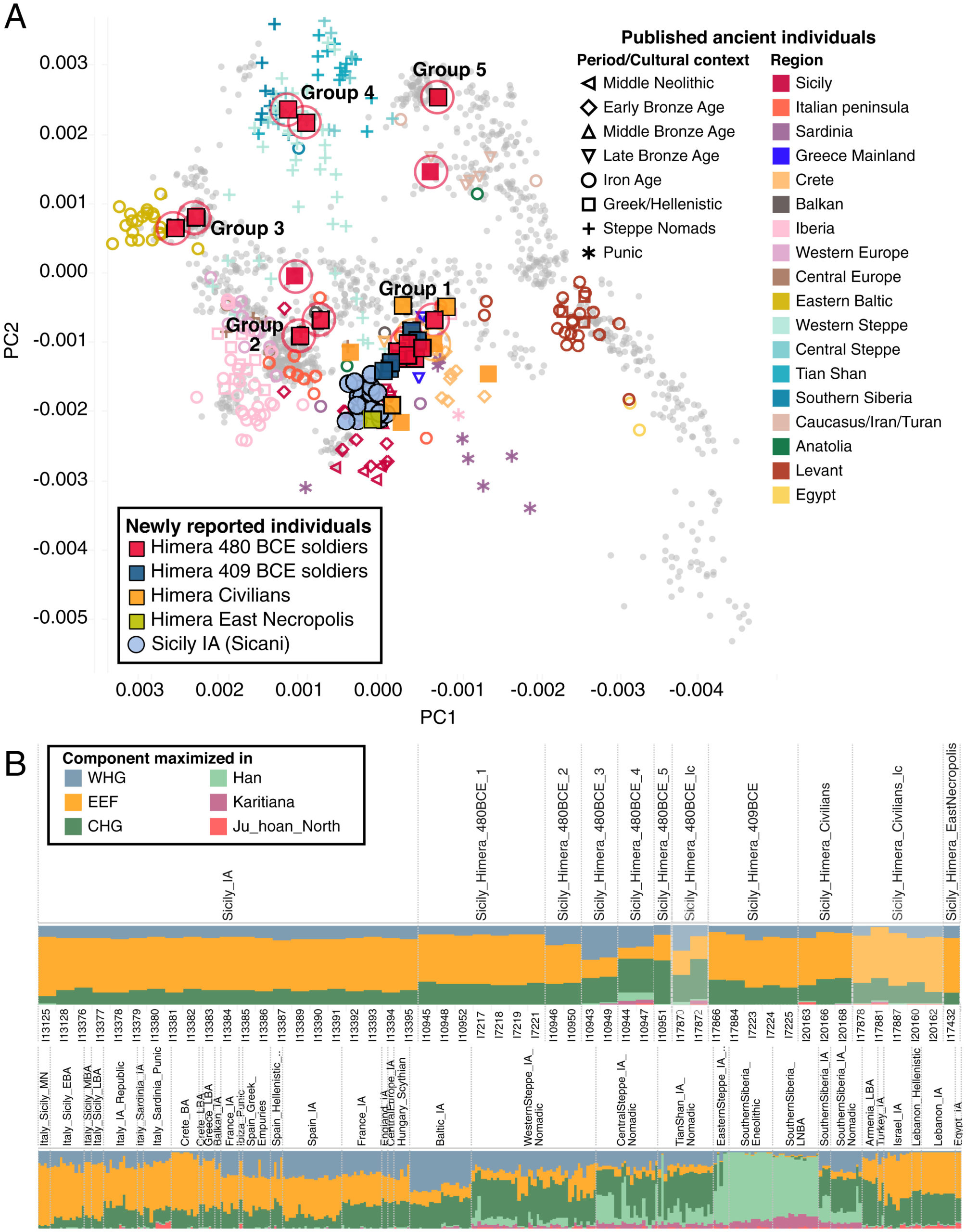 Οι επιστήμονες ανέλυσαν το γονιδίωμα 54 σκελετών ανθρώπων που βρέθηκαν, μερικοί μαζί με τα όπλα τους, σε μαζικούς τάφους στις νεκροπόλεις της Ιμέρας και πέριξ αυτής. Μεταξύ αυτών ήταν στρατιώτες του 5ου π.Χ. αιώνα ηλικίας 18-50 ετών που είχαν πολεμήσει στον στρατό της ελληνικής βόρειας σικελικής αποικίας της Ιμέρας (στη νικηφόρα για τους Έλληνες καθοριστική μάχη του 480 π.Χ. κατά των Καρχηδονίων και των ντόπιων συμμάχων τους), καθώς επίσης πολίτες κάτοικοι της περιοχής και κοντινών οικισμών με γηγενείς πληθυσμούς. Επίσης, για λόγους σύγκρισης, αναλύθηκαν τα γονιδιώματα 96 σύγχρονων ανθρώπων από την Ιταλία, την ηπειρωτική Ελλάδα και την Κρήτη.