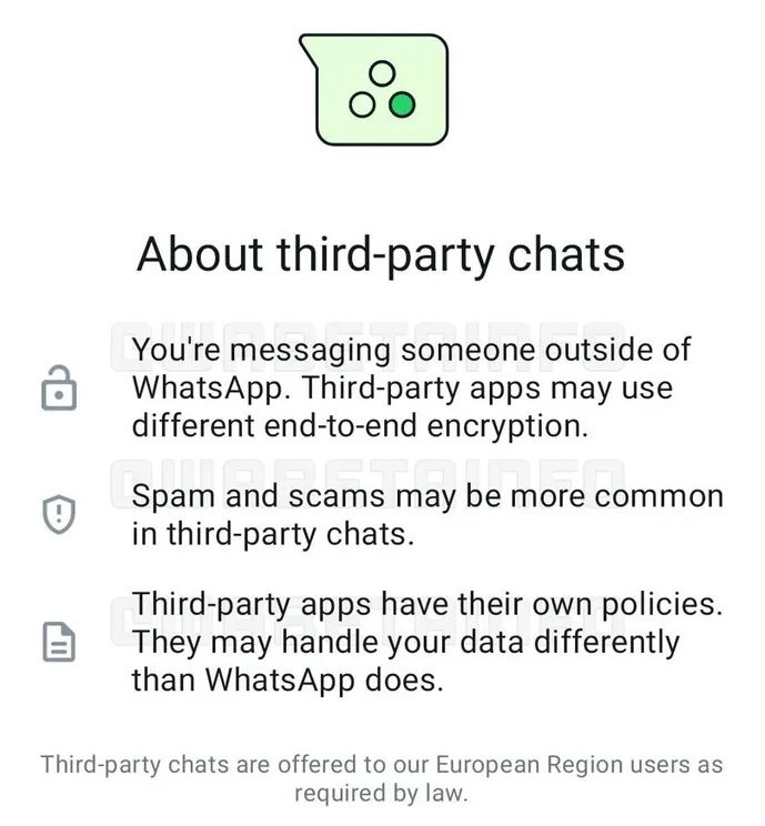 Το screenshot που χρησιμοποιεί το WABetaInfo αποκαλύπτει ότι η WhatsApp θα επιτρέπει στους χρήστες να επιλέξουν πώς να προχωρήσουν. Αναφέρει: «Στέλνετε μήνυμα σε κάποιον εκτός του WhatsApp. Οι εφαρμογές τρίτων ενδέχεται να χρησιμοποιούν διαφορετική κρυπτογράφηση από άκρο σε άκρο». Προειδοποιεί επίσης ότι άλλες εφαρμογές «ενδέχεται να χειρίζονται τα δεδομένα σας διαφορετικά».