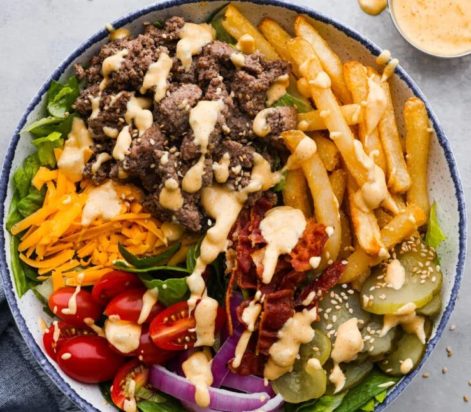 Αυτό το αποδομημένο μπολ μπέργκερ είναι τόσο χορταστικό, που θα λατρέψετε κάθε μπουκιά! Η συνταγή περιλαμβάνει τραγανές πατάτες, τρυφερό μοσχάρι, τουρσιά και άλλα φρέσκα λαχανικά, όλα επικαλυμμένα με σπιτική σάλτσα.