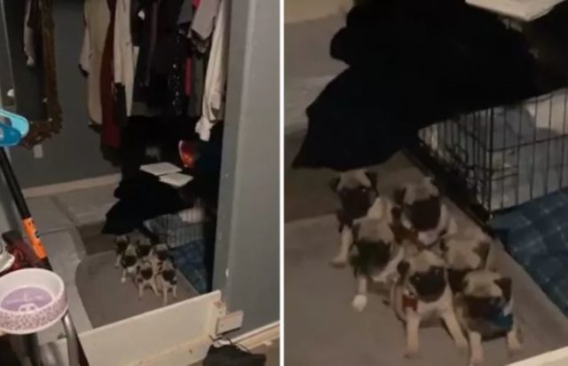 Το ίδιο έκαναν και 6 κουτάβια, ράτσας pug, που βρήκαν τρόπο να τρυπώσουν στην ντουλάπα του σπιτιού για μία «μυστική» συνάντηση. Ο ιδιοκτήτης, όπως ήταν φυσικό, τα έψαξε και τα βρήκε όλα μαζί να τον κοιτάζουν. Η στιγμή έχει καταγραφεί σε βίντεο που δημοσιεύθηκε στο TikTok και προκάλεσε «βροχή» αστείων σχολίων από τους χρήστες.