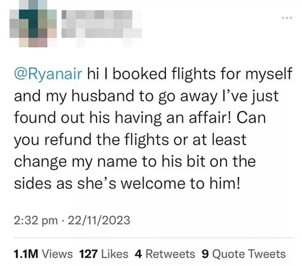 Συγκεκριμένα, μια γυναίκα που διαπίστωσε ότι ο άνδρας της είχε εξωσυζυγική σχέση παρακάλεσε δημοσίως την Ryanair να αλλάξει τα στοιχεία, ώστε να πάρει η ερωμένη τη θέση της και να ταξιδέψει μαζί με τον σύζυγό της.