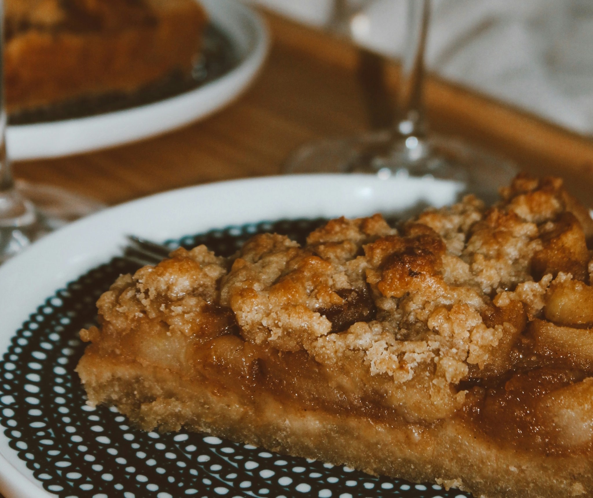 - Προθερμάνετε τον φούρνο στους 220°C. Σε ένα μεγάλο μπολ, ανακατέψτε απαλά τα μήλα, το αλεύρι, τη ζάχαρη, το μηλόξυδο, την κανέλα, το αλάτι, το μοσχοκάρυδο, το τζίντζερ και το μπαχάρι.