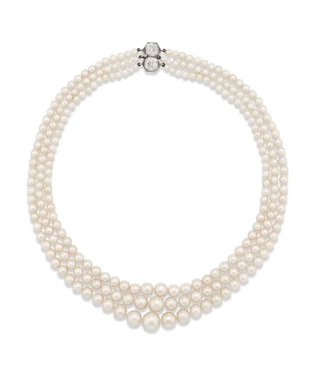 Τρεις σειρές από διαβαθμισμένα φυσικά μαργαριτάρια που κυμαίνονται περίπου από 10,50 έως 3,20 mm, διαμάντια παλιάς κοπής, λευκό χρυσό 18 καρατίων. Φωτογραφία: Christies