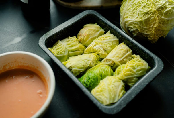- Ξεφλουδίστε περίπου 12 μεγάλα φύλλα λάχανου, κρατώντας τυχόν σκισμένα εξωτερικά κομμάτια για να στρώσετε το ταψί αργότερα.