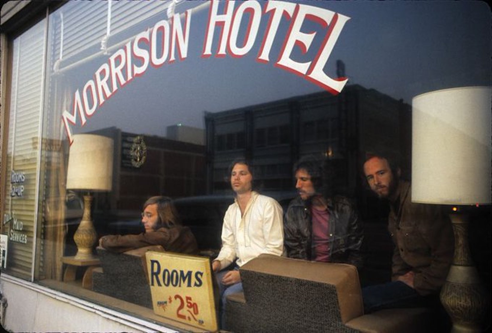 Φωτογραφία των Doors μπροστά στο μπαρ “Hard Rock Cafe” στο κέντρο του Los Angeles (1969). H ιστορία εδώ έχει ως εξής: Στο κέντρο του Los Angeles υπήρχε ένα φθηνό ξενοδοχείο που λεγόταν “Morrison Hotel”, είχε δηλαδή για όνομα το επίθετο του τραγουδιστή του συγκροτήματος, του Jim Morrison. Επρόκειτο για ένα ξενοδοχείο στην Hope Street, που είχε ανοίξει το 1914 και είχε μόνο μονόκλινα δωμάτια προς 2,5 δολάρια τη βραδιά. Το είχε ανακαλύψει ο κημπορντίστας του συγκροτήματος, ο Ray Manzarek. Το γκρουπ φωτογραφήθηκε στο εν λόγω ξενοδοχείο, χρησιμοποίησε την φωτογραφία στο 5ο άλμπουμ τους, το οποίο το ονόμασαν “Morrison Hotel”.