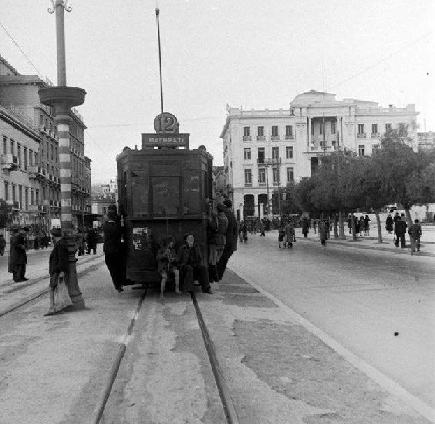 Στη φωτογραφία που έχει τραβηχτεί τον Δεκέμβριο του 1944 βλέπετε την λεωφόρο Βασιλίσσης Αμαλίας με το τραμ. Αριστερά βρίσκεται το ξενοδοχείο Μεγάλη Βρεταννία. Η εικόνα είναι του φωτογράφου Dmitri Kessel.