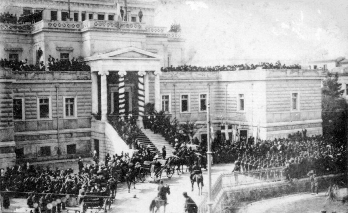 Τα σχέδια τροποποιήθηκαν από τον Έλληνα αρχιτέκτονα Παναγιώτη Κάλκο, και η κατασκευή ολοκληρώθηκε το 1871. Κατά τη διάρκεια των έργων, το Κοινοβούλιο στεγαζόταν στο πίσω μέρος της πλατείας, σε ένα κτήριο από τούβλα, που χτίστηκε βιαστικά το 1863, και έγινε ευρέως γνωστό με το όνομα «Η Παράγκα».