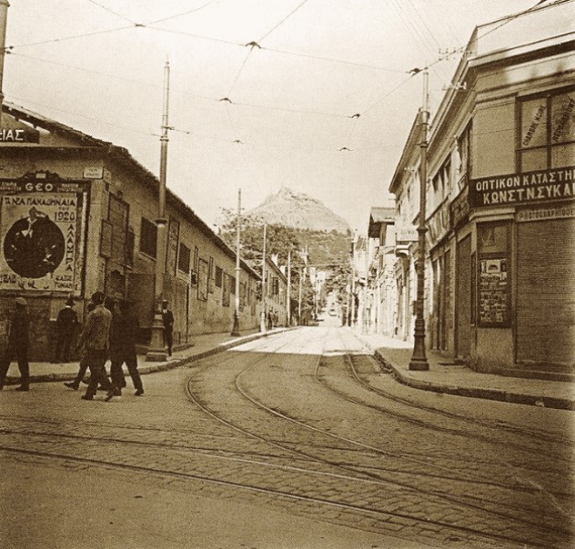 Στη φωτογραφία που έχει τραβηχτεί το 1920 βλέπετε την οδό Σταδίου και το σημερινό μέγαρο του Μετοχικού Ταμείου Στρατού. Στα αριστερά είναι οι βασιλικοί στάβλοι και στο βάθος ο Λυκαβηττός.
