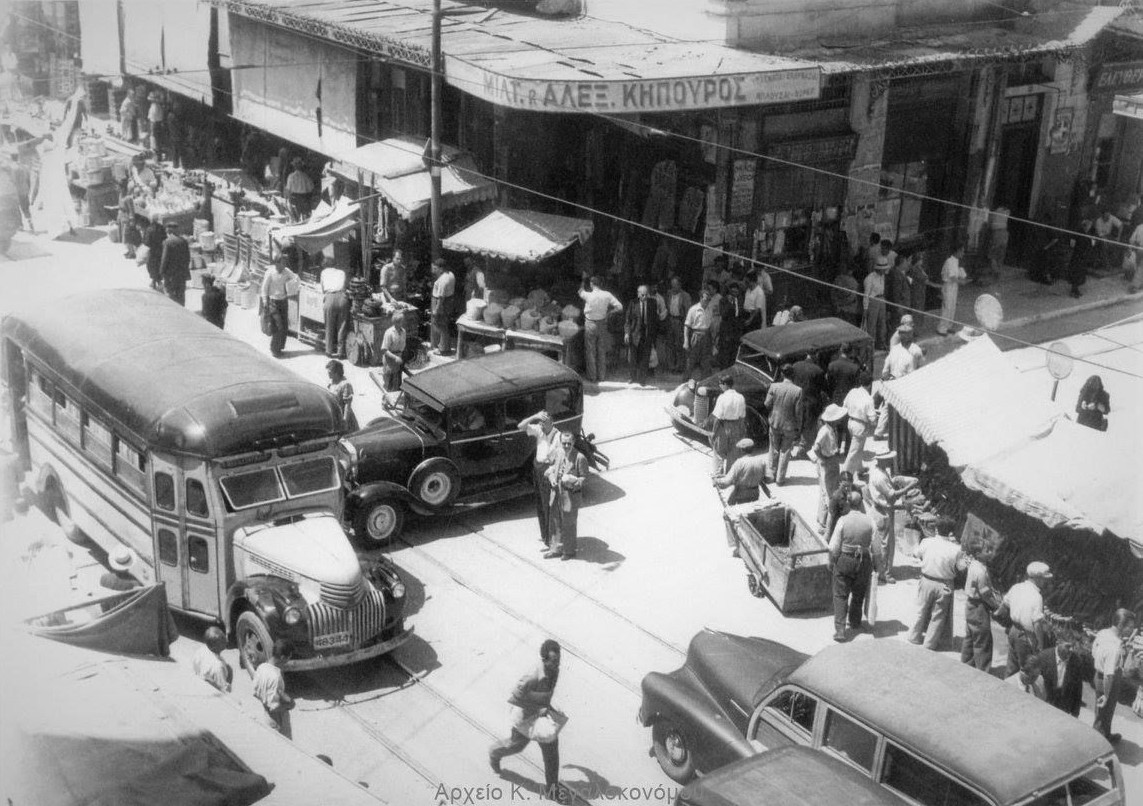 Στην φωτογραφία που έχει τραβηχτεί την δεκαετία του 1950 βλέπετε την οδό Αθηνάς. Στα δεξιά είναι η οδός Ευρυπίδου. Η εικόνα ανήκει στο αρχείο Κ. Μεγαλοκονόμου.
