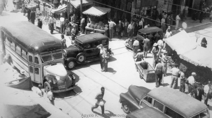 Στην φωτογραφία που έχει τραβηχτεί την δεκαετία του 1950 βλέπετε την οδό Αθηνάς. Στα δεξιά είναι η οδός Ευρυπίδου. Η εικόνα ανήκει στο αρχείο Κ. Μεγαλοκονόμου.