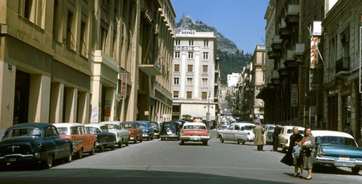 Στη φωτογραφία που έχει τραβηχτεί τον Απρίλιο του 1958 βλέπετε την οδό Βουκουρεστίου Πανεπιστημίου. Αριστερά είναι το Μέγαρο του Μετοχικού Ταμείου Στρατού με την είσοδο του θεάτρου “Παλλάς”. Η φωτογραφία ανήκει στον Seymour Katcoff.
