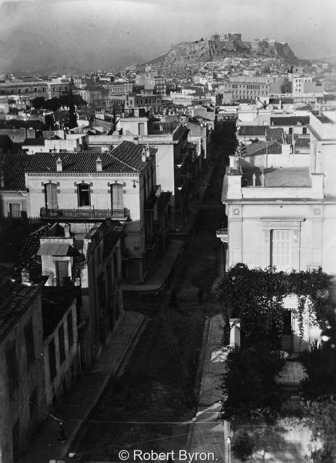 Στην φωτογραφία, που έχει τραβηχτεί από τον φωτογράφο Robert Byron μπορείτε να δείτε την Οδό Πινδάρου στο Κολωνάκι. Η εικόνα έχει ληφθεί στο διάστημα 1925 με 1930 και στο βάθος διακρίνεται η Ακρόπολη.