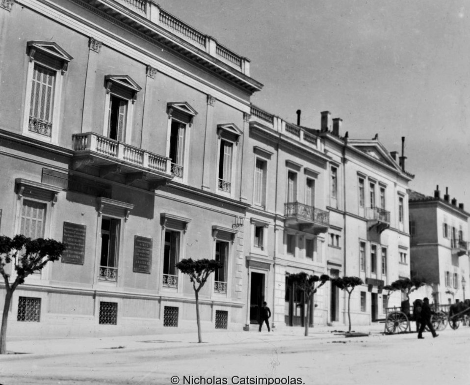 Στην φωτογραφία φαίνεται η οδός Κοραή στο κέντρο της Αθήνας. Η εικόνα έχει τραβηχτεί την χρονική περίοδο 1880-1920 και προέρχεται από την συλλογή Nicholas Catsimpoolas, διαφάνεια από το αρχείο της Δημόσιας Βιβλιοθήκης της Βοστώνης.