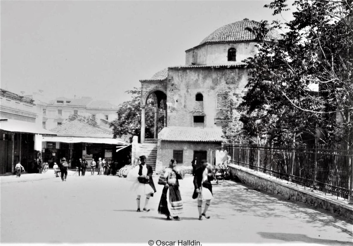 Στην φωτογραφία, που έχει τραβηχτεί από τον φωτογράφο Oscar Halldin μπορείτε να δείτε την Οδό Άρεως στο Μοναστηράκι. Η εικόνα έχει ληφθεί το 1906 και μπορείτε να διακρίνετε άνδρες ντυμένους με φουστανέλες και το τζαμί που χτίστηκε από τον Τούρκο βοεβόδα Τζισταράκη το 1759 με υλικό παρμένο από παλαιά κτίρια.