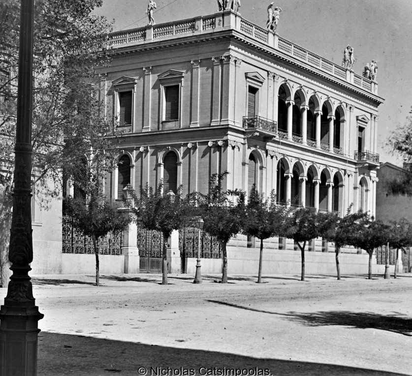 Στην φωτογραφία φαίνεται η οδός Πανεπιστημίου. Η εικόνα προέρχεται από την συλλογή Nicholas Catsimpoolas, διαφάνεια από το αρχείο της Δημόσιας Βιβλιοθήκης της Βοστώνης. Στην εικόνα μπορείτε να διακρίνετε την αρχοντική κατοικία του αρχαιολόγου Ερρίκου Σλίμαν η οποία σήμερα στεγάζει το Νομισματικό Μουσείο. Το κτίριο είναι έργο του αρχιτέκτονα Ερνέστου Τσίλλερ.