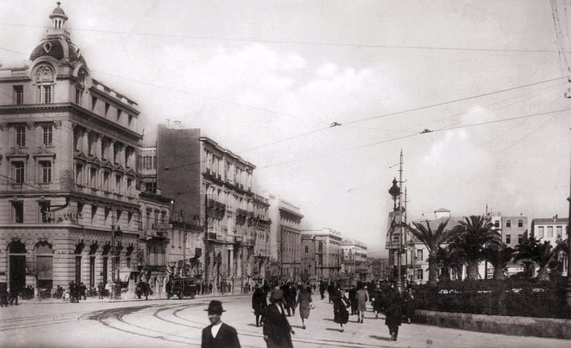 Στη φωτογραφία που έχει τραβηχτεί το 1928 βλέπετε την οδό Πανεπιστημίου. Το κτίριο με τον τρούλο είναι το Γενικό Λογιστήριο του Κράτους στην συμβολή των οδών Πανεπιστημίου και Κοραή.