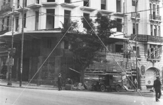 Στο στιγμιότυπο του 1920 διακρίνονται το ΜΕΓΑΡΟ ΜΑΛΑΓΗΡΗ, διαβάτες και σταθμευμένο όχημα του ζαχαροπλαστείου «ΝΕΟΝ» στην γωνία του δρόμου.
