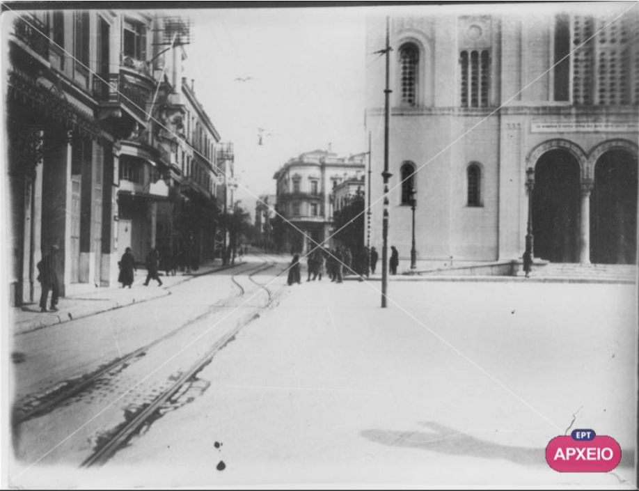 Στην φωτογραφία, η οποία αποτελεί μέρος του πλούσιου φωτογραφικού αρχείου της ΕΡΤ και της συλλογής «Πέτρου Πουλίδη», φαίνεται άποψη της οδού Μητροπόλεως, στο ύψος της Μητρόπολης ενώ στον δρόμο διακρίνονται και οι γραμμές του τραμ.
