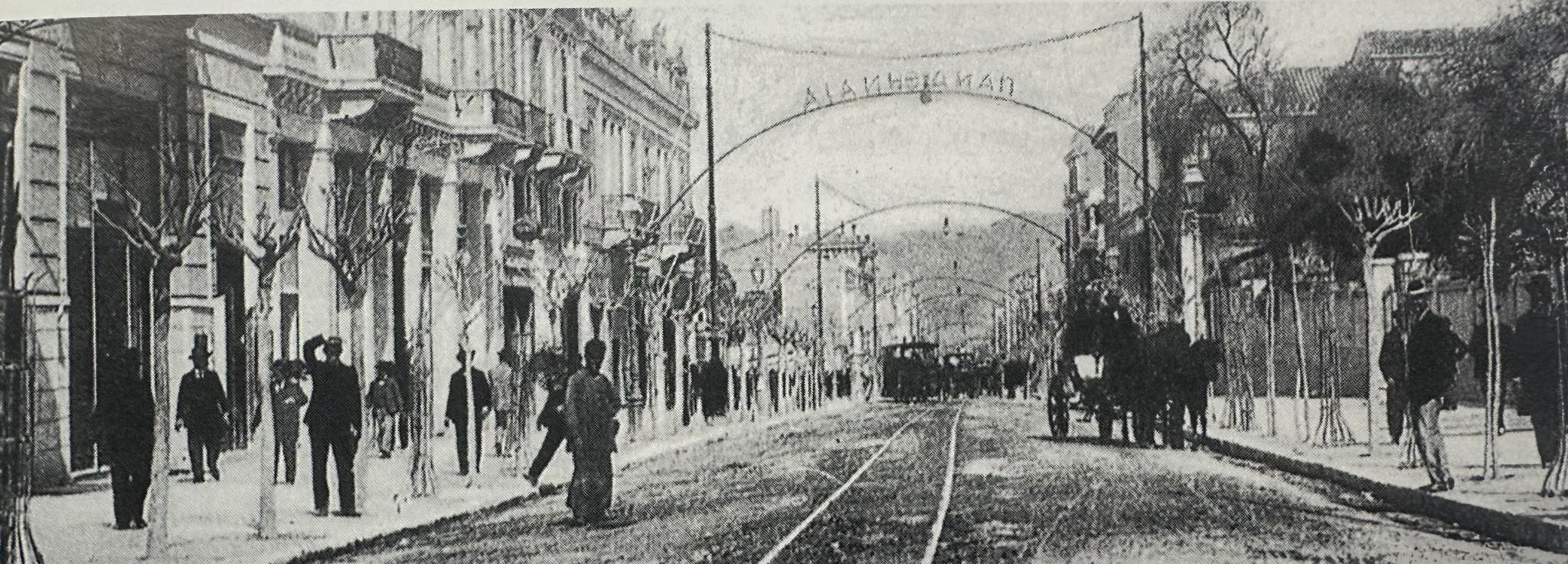 Στη φωτογραφία βλέπετε μία άποψη της οδός Σταδίου. Το στιγμιότυπο χρονολογείται στις αρχές του 20ου αιώνα. Ειδικότερα, η φωτογραφία τραβήχτηκε το 1903 και στα δεξιά απεικονίζονται οι τότε βασιλικοί στάβλοι ενώ στα αριστερά φαίνεται το κάτω μέρος του μεγάρου Βουγά.