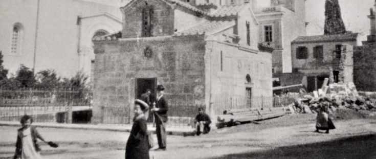 Στην φωτογραφία που έχει τραβηχτεί το διάστημα 1890 -1895 βλέπετε την πλατεία Μητροπόλεως και τον Ιερό Ναό της Παναγίας Γοργοεπηκόου και Αγίου Ελευθερίου. Η εικόνα ανήκει στην συλλογή Nicholas Catsimpoolas και βρίσκεται στο αρχείο της Δημόσιας Βιβλιοθήκης της Βοστώνης.