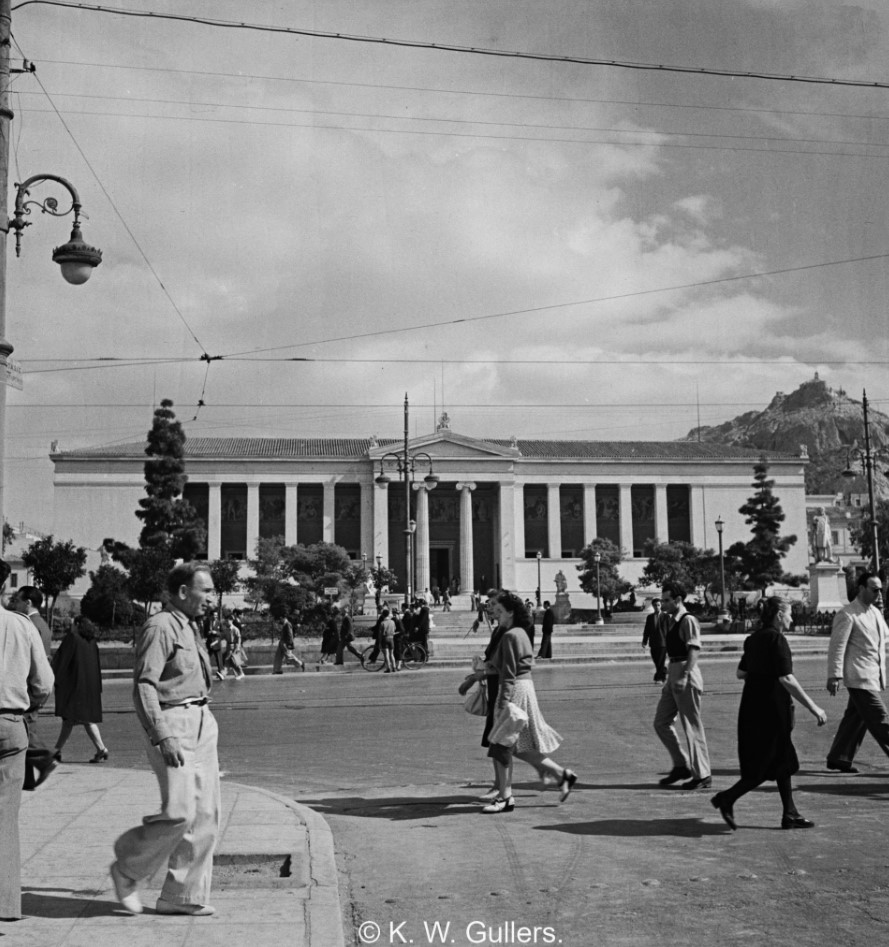 Στη φωτογραφία που έχει τραβηχτεί το 1947 βλέπετε το κέντρο της Αθήνας. Συγκεκριμένα στην εικόνα φαίνεται η οδός Πανεπιστημίου στη συμβολή με την οδό Κοραή και άποψη του Εθνικού Καποδιστριακού Πανεπιστημίου Αθηνών. Η φωτογραφία έχει ληφθεί από τον K. W. Gullers.