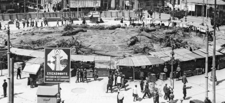 Στην φωτογραφία που έχει τραβηχτεί το 1927 από τον φωτογράφο Δημήτρη Γιάγκογλου βλέπετε την πλατεία Ομονοίας. Η πλατεία βρίσκεται σε φάση αναμόρφωσης καθώς ξεριζώνονται τρα φοινικόδεντρα. Απέναντι είναι η οδός Αγίου Κωνσταντίνου και δεξιά το θέατρο Κοτοπούλη. Στην πλατεία έχουν σταθμεύσει αραμπάδες, δηλαδή άμαξες που λειτουργούσαν εκείνα τα χρόνια ως ταξί.