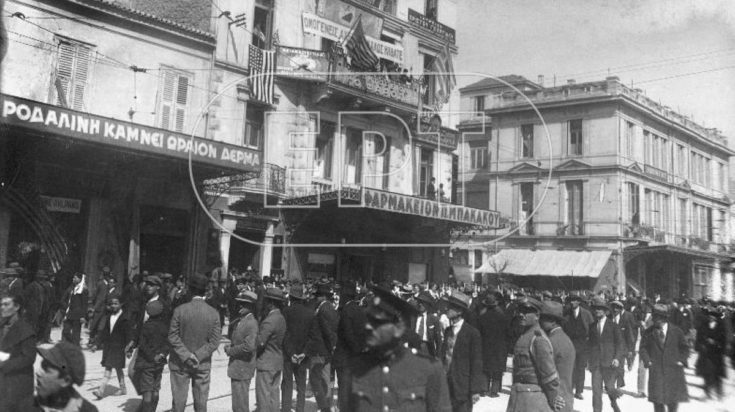 Στην φωτογραφία που έχει τραβηχτεί το 1928 βλέπετε την πλατεία Ομονοίας και την επίσκεψη των μελών της Αμερικανικής ομογενειακής οργάνωσης ΑΧΕΠΑ (AHEPA) στην Αθήνα. Μέλη του συλλόγου βρίσκονται έξω από το κτίριο όπου στεγάζεται το πρακτορείο ‘Ο ΦΑΡΟΣ’, και το γνωστό φαρμακείο του Μπακάκου επί της πλατείας Ομονοίας και Αγίου Κωνσταντίνου.