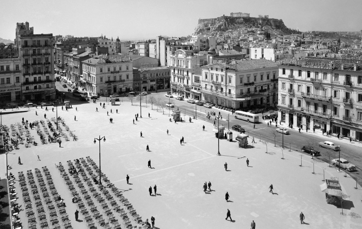 Στη φωτογραφία που έχει τραβηχτεί την δεκαετία του 1950 από τον Δημήτρη Χαρισιάδη βλέπετε την πλατεία Συντάγματος.