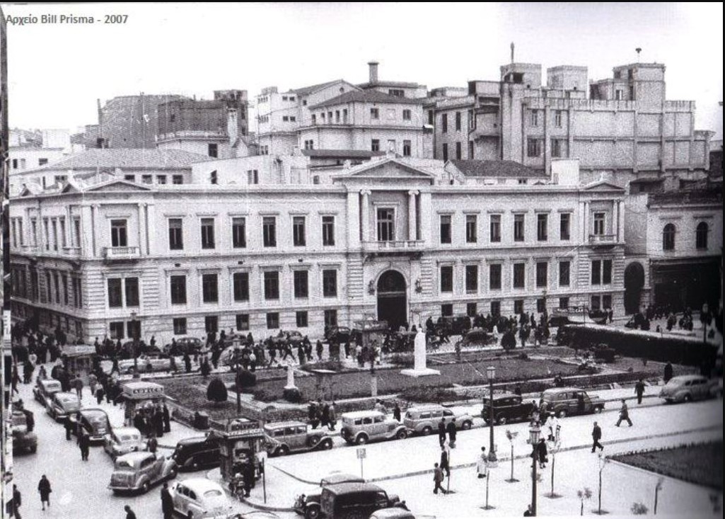 Στη φωτογραφία της Ans Westra που έχει τραβηχτεί το 1952 βλέπετε την Πλατεία Κοτζιά και το Μέγαρο Εθνικής Τράπεζας της Ελλάδος.