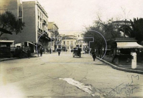 Στη φωτογραφία που έχει τραβηχτεί το 1917 βλέπετε την πλατεία Κολωνακίου στην οδό Πατριάρχου Ιωακείμ. Η εικόνα ανήκει στο αρχείο της ΕΡΤ.