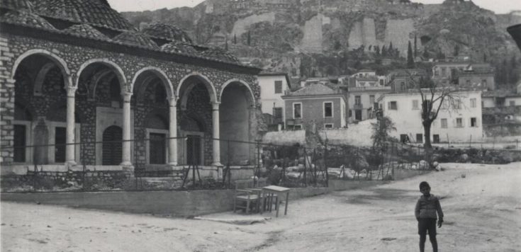 Στη φωτογραφία που έχει τραβηχτεί την δεκαετία του 1940 βλέπετε την Πλάκα και το Φετιχέ τζαμί. Η Πλάκα είναι από τις λιγοστές συνοικίες της πόλης -αν όχι η μοναδική- η οποία κατοικείτο αδιάκοπα από την αρχαιότητα και ήταν εκτός άλλων το κέντρο των Αρχαίων Αθηνών. Η άμεση σύνδεση της περιοχής με το λαμπρό παρελθόν της Αρχαίας Αθήνας, η οποία γίνεται προφανής στον επισκέπτη από τα δεκάδες μνημεία που βρίσκονται διάσπαρτα σε αυτή την έχουν κάνει γνωστή -και όχι άδικα- ως τη Συνοικία των Θεών.