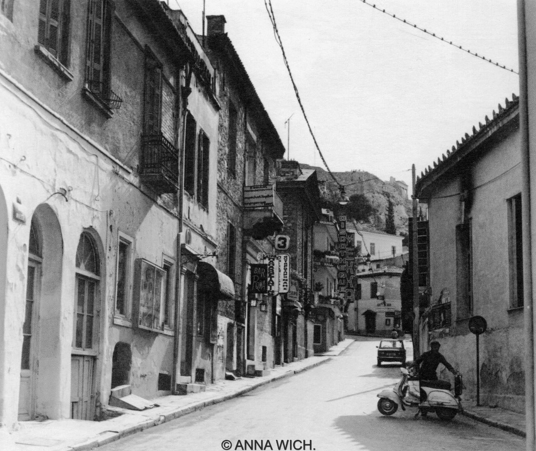 Στην φωτογραφία που έχει τραβηχτεί την δεκαετία του 1977 από την Anna Wich βλέπετε την Πλάκα και την οδό Φλέσσα.