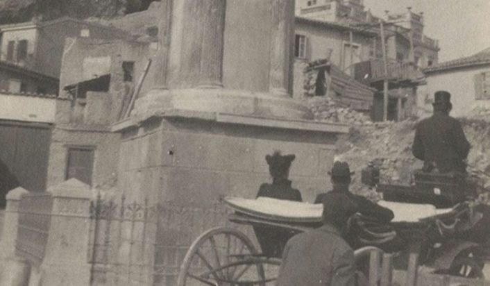 Στην φωτογραφία που έχει τραβηχτεί στις αρχές του 1900 βλέπετε την Πλάκα και το Μνημείου του Λυσικράτους. Το Μνημείο Λυσικράτους, γνωστό και ως Φανάρι του Διογένη, είναι ένα πέτρινο κτίσμα κυλινδρικού σχήματος, το καλύτερα σωζόμενο χορηγικό μνημείο της αρχαιότητας. Βρίσκεται στην Αθήνα, επί της αρχαίας οδού Τριπόδων και κτίστηκε από τον Λυσικράτη το 335-334 π.Χ. προκειμένου να στηρίζει και να αναδεικνύει ένα σημαντικό αντικείμενο στην κορυφή του: τον χάλκινο τρίποδα που του είχε δοθεί ως έπαθλο για τον ρόλο του ως χορηγού (χρηματοδότη) του νικητήριου θεατρικού έργου στους τελευταίους δραματικούς αγώνες.