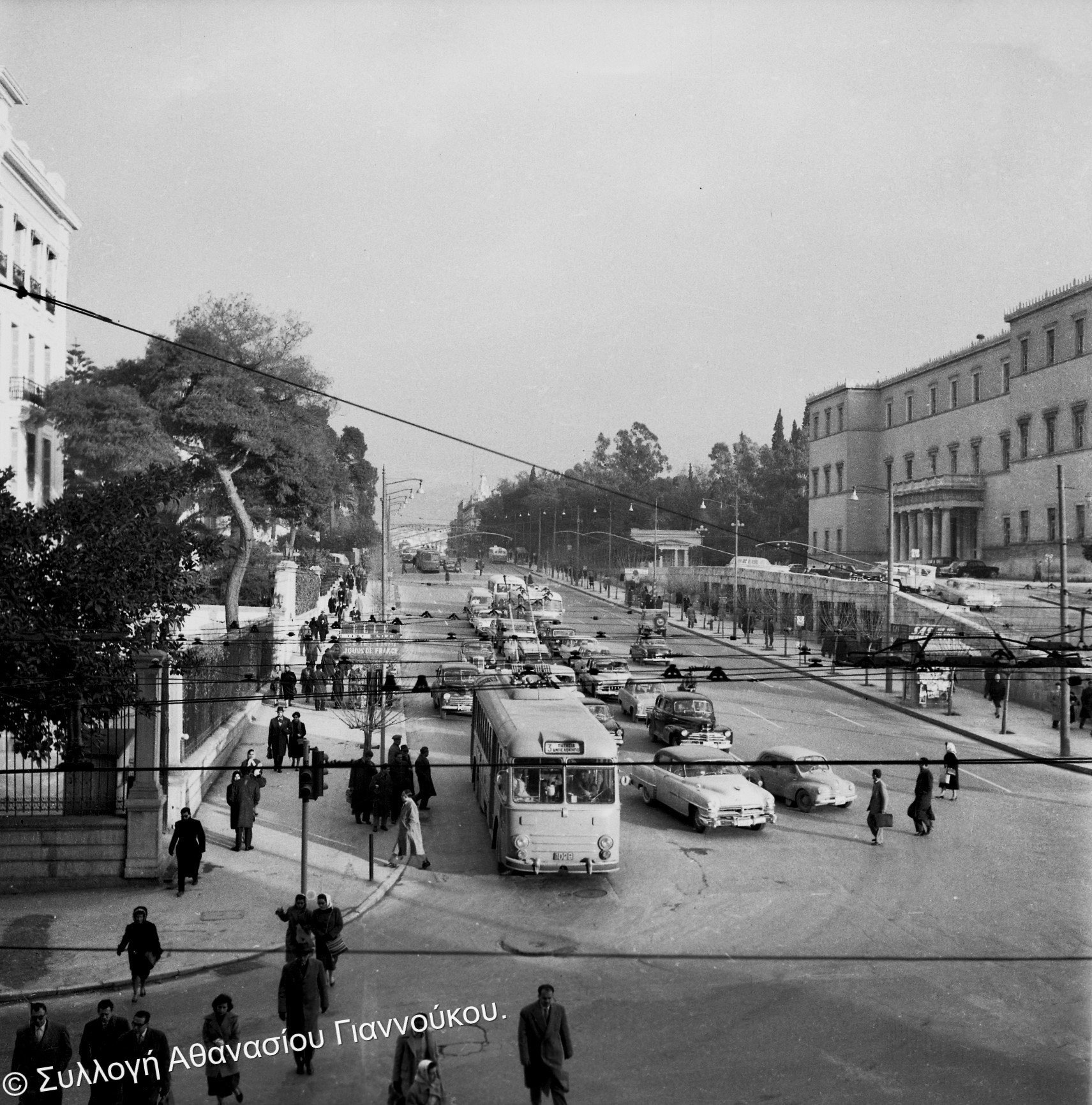 Στη φωτογραφία που έχει τραβηχτεί την περίοδο 1958-1961 από το ξενοδοχείο «Μεγάλη Βρεταννία» βλέπετε τη λεωφόρο Βασιλίσσης Σοφίας, και δεξιά τη Βουλή των Ελλήνων.