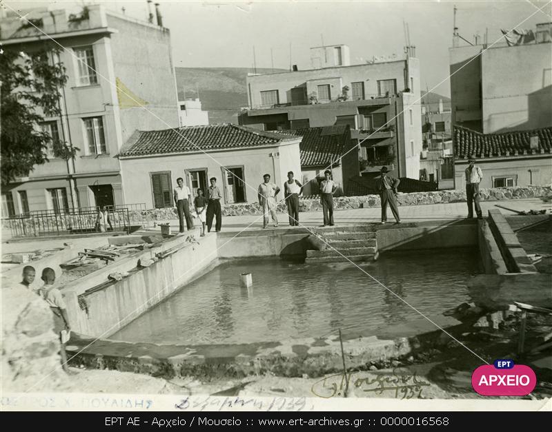 Συγκεκριμένα, πρόκειται για τη γνωστή Πλατεία Δεξαμενής. Άποψη της νότιας πλευράς της πλατείας προς την οδό Γλύκωνος. Κατασκευάστηκε από τον δήμο το 1931 και λειτούργησε ως πισίνα με θαλασσινό νερό για παιδιά.