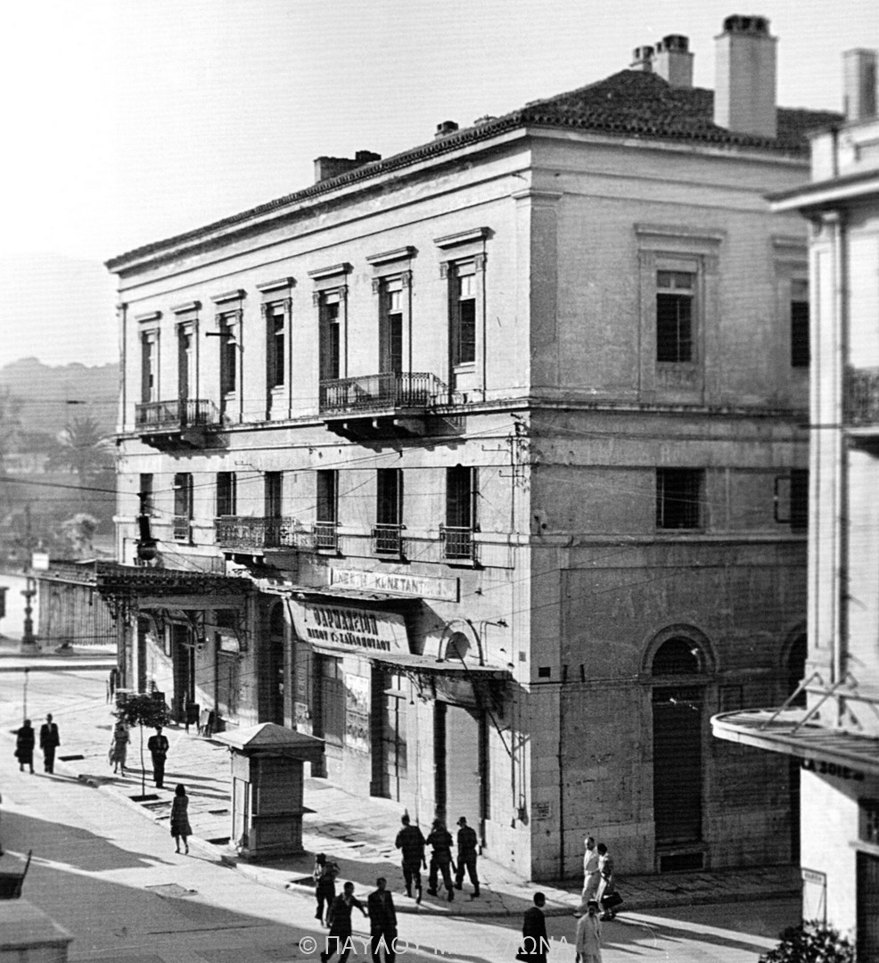Στην Αθήνα βλέπουμε το Μέγαρο του εκδότη Ανδρέα Κορομηλά. Όψη επί της οδού Ερμού και δεξιά λίγο από την οδό Νίκης, 1945, από το βιβλίο Η ΝΕΟΚΛΑΣΣΙΚΗ ΑΘΗΝΑ ΤΟΥ ΠΑΥΛΟΥ Μ. ΜΥΛΩΝΑ. Κατεδαφίστηκε τη δεκαετία του 60′.