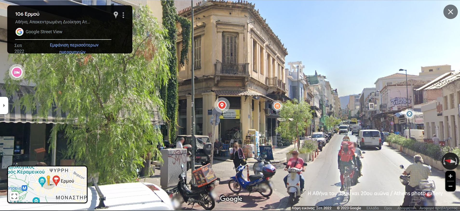 Στη φωτογραφία του 1966 βλέπετε την οδό Ερμού στο ύψος της οδού Καραΐσκάκη. Στο βάθος δεξιά είναι η πλατεία του Μοναστηρακίου. Το βουνό που διακρίνεται είναι ο Υμηττός. Το αριστερό γωνιακό διώροφο υπάρχει και σήμερα, (ως κατάστημα επίπλων). Το ίδιο ισχύει και για τα περισσότερα κτίρια που φαίνονται στη φωτογραφία.