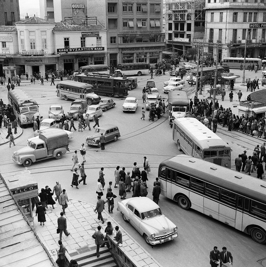 Στην φωτογραφία (φωτογράφος: Δημήτρης Χαρισιάδης) που έχει τραβηχτεί το 1955 βλέπετε την πλατεία Ομονοίας και απέναντι την οδό Αγίου Κωνσταντίνου.