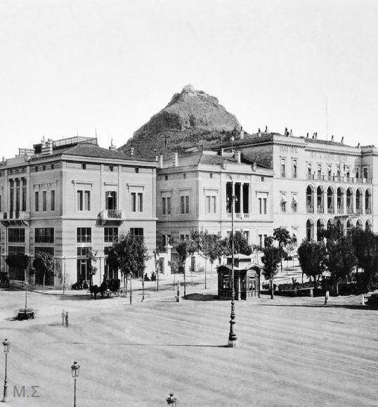 Στην φωτογραφία (Αρχείο: Deutsche Fotothek) που έχει τραβηχτεί το 1890 βλέπετε την πλατεία Συντάγματος και διακρίνονται οι βασιλικοί στάβλοι του βασιλιά Όθωνα.