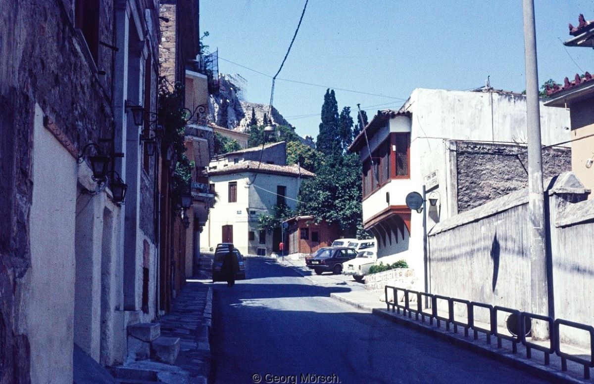 Στην φωτογραφία που έχει τραβηχτεί το 1981 από τον φωτογράφο Georg Mörsch βλέπετε την Πλάκα και τις οδούς Λυσίου και Τριπόδων.