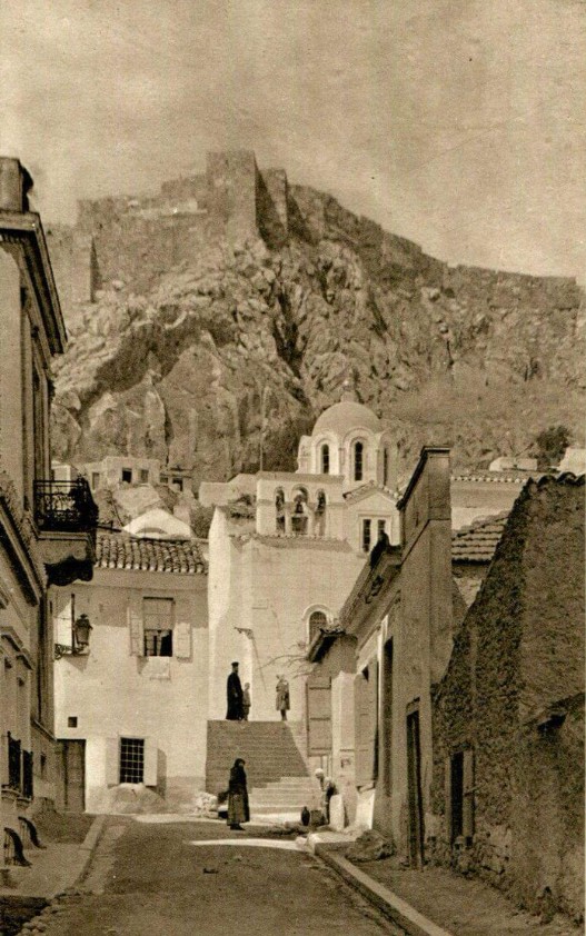 Στην φωτογραφία που έχει τραβηχτεί την δεκαετία του 1920 βλέπετε την Πλάκα και την οδό Επιχάρμου. Στο βάθος βρίσκεται ο ιερός ναός του Αγίου Νικολάου Ραγκαβά.