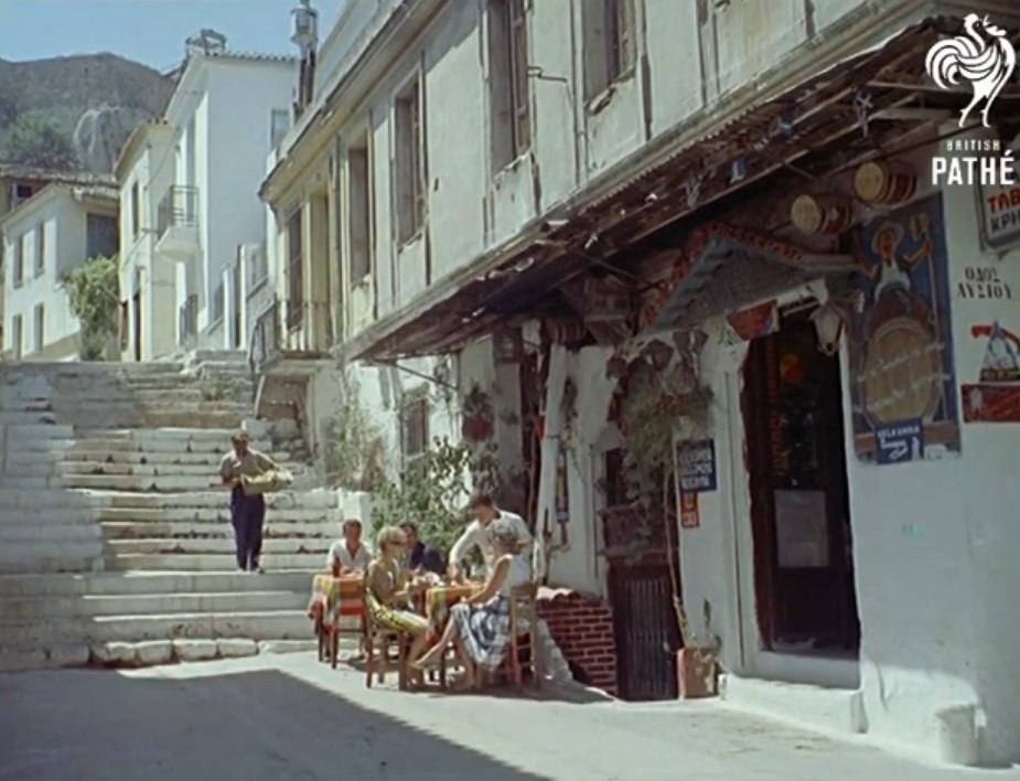 Στην φωτογραφία που έχει τραβηχτεί το 1961 και προέρχεται από το βίντεο Αthens: The Eye of Greece (1961) | British Pathé βλέπετε την Πλάκα και την οδό Μνησικλέους με τα γραφικά σκαλοπάτια.