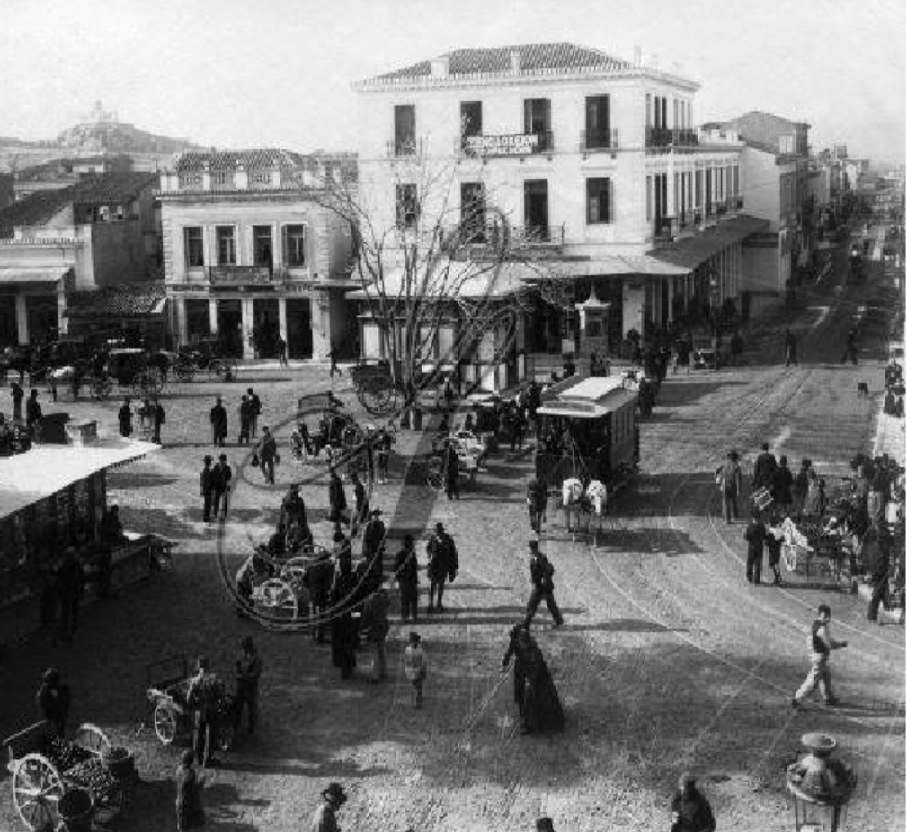 Το γωνιακό τριώροφο ήταν το ξενοδοχείο “Το Ηράκλειον”, (κτισμένο τα τέλη του 19ου αιώνα). Αριστερά είναι το εκκλησάκι της Παναγίας της Παντάνασσας του 10ου αιώνα. Πάνω αριστερά διακρίνεται το Αστεροσκοπείο Αθηνών, (του 1842).